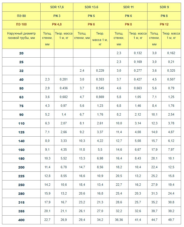 Поліетиленові труби для газу виготовляються з поліетилену з мінімальною тривалою міцністю Мrs 8,0 МПа (труби ПЕ 80) і Мrs 10,0 МПа (труби ПЕ 100), сортамент газових ПЕ труб наведено в таблиці №1.